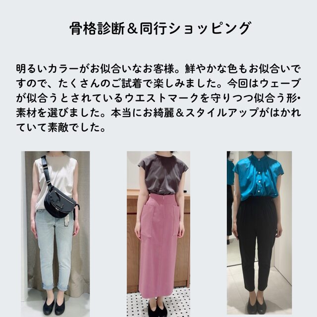 まずはお客様の雰囲気に合わせたスタイリングをご提案しました。カジュアルスタイルよりも、エレガントな印象がより引きたつお顔立ちでしたので、華やかな色使いのコーディネートをご案内。